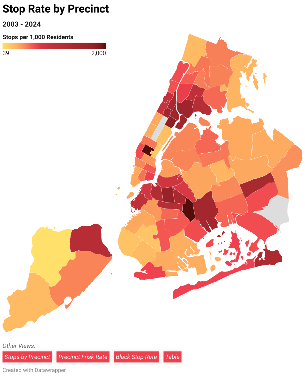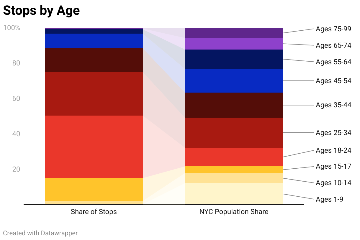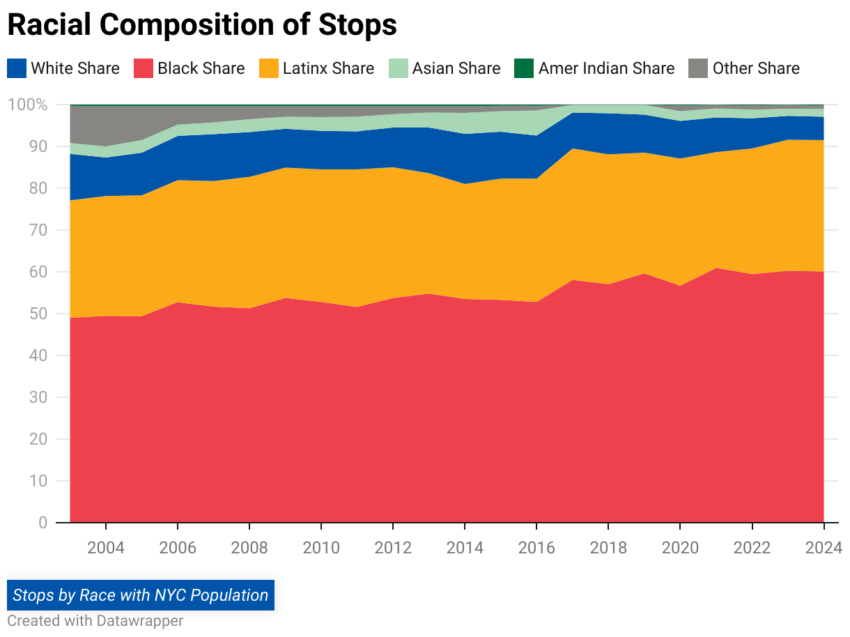 From 2003-2024, 90 percent of people stopped by the NYPD were people of color. Black and Latinx New Yorkers made up 52 percent and 31 percent of all stops despite being 23 and 29 percent of the population, respectively. White New Yorkers only made up 10 percent of stops though they represent 33 percent of the population.