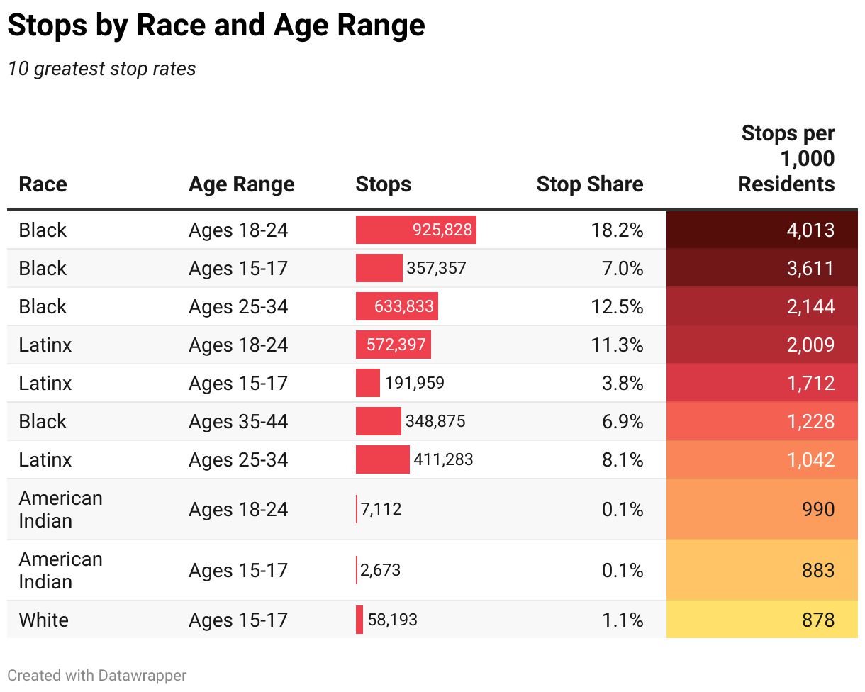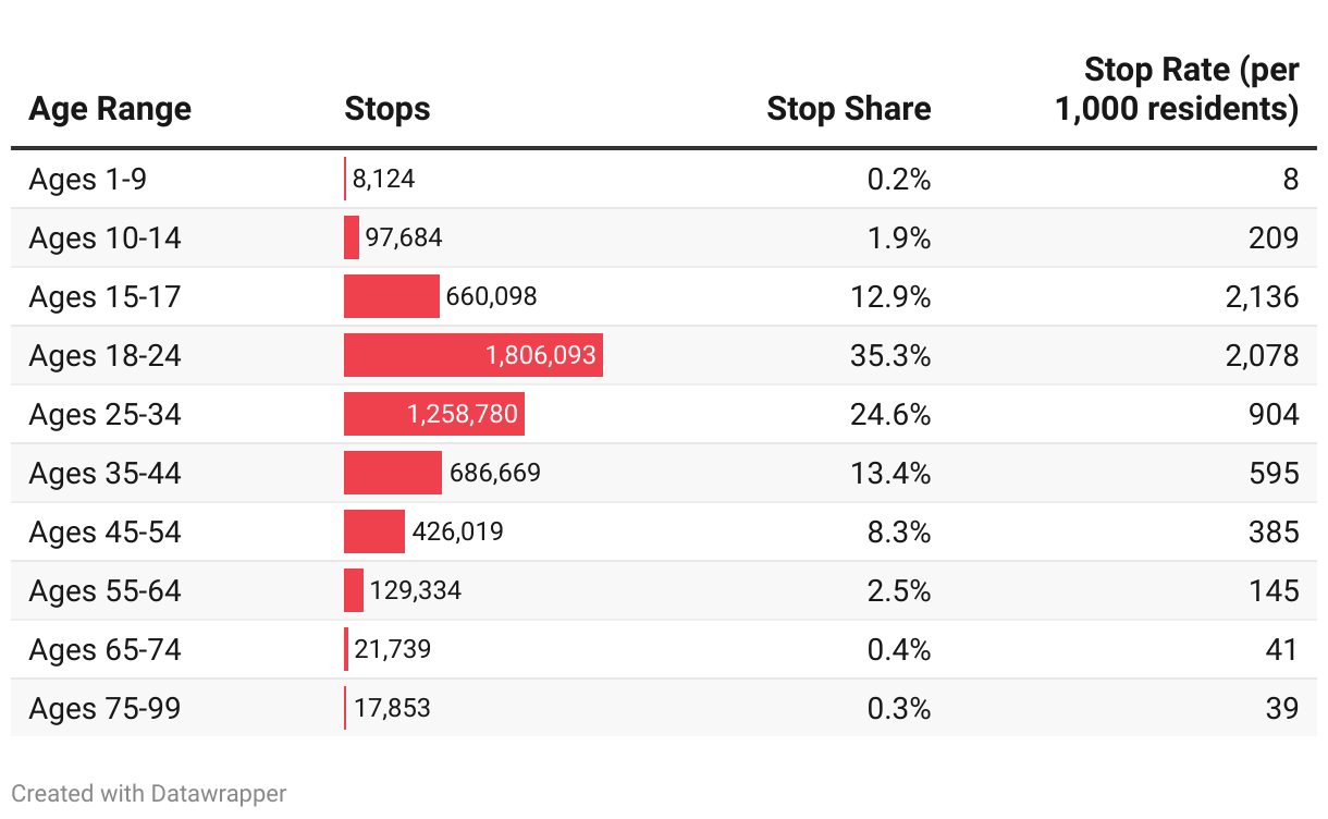 Black people aged 18-24 were stopped over 900,000 times from 2003-2022. They accounted for 18 percent of all stops, nearly double the number experienced by white people of all ages (close to 500,000 times). Over the last two decades, Black 18-24-year-olds living in New York City have been stopped four times, on average.